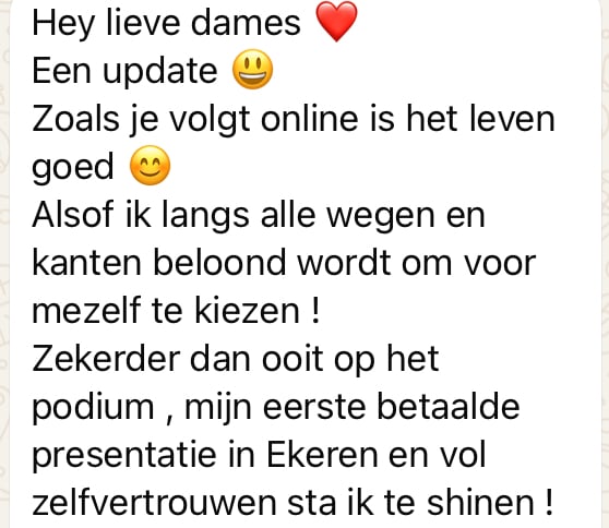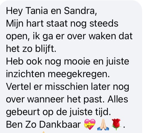 Het heeft mij ontzettend geholpen om te zijn wie ik nu ben geworden. Met mijn faalangst, onzekerheid en van alles en nog wat. Nu ben ik een stuk zekerder geworden. Ik val nog af en toe terug in oude patronen maar door de sleutels die je me hebt gegeven vind ik sneller mijn weg terug naar “mijn thuis”.